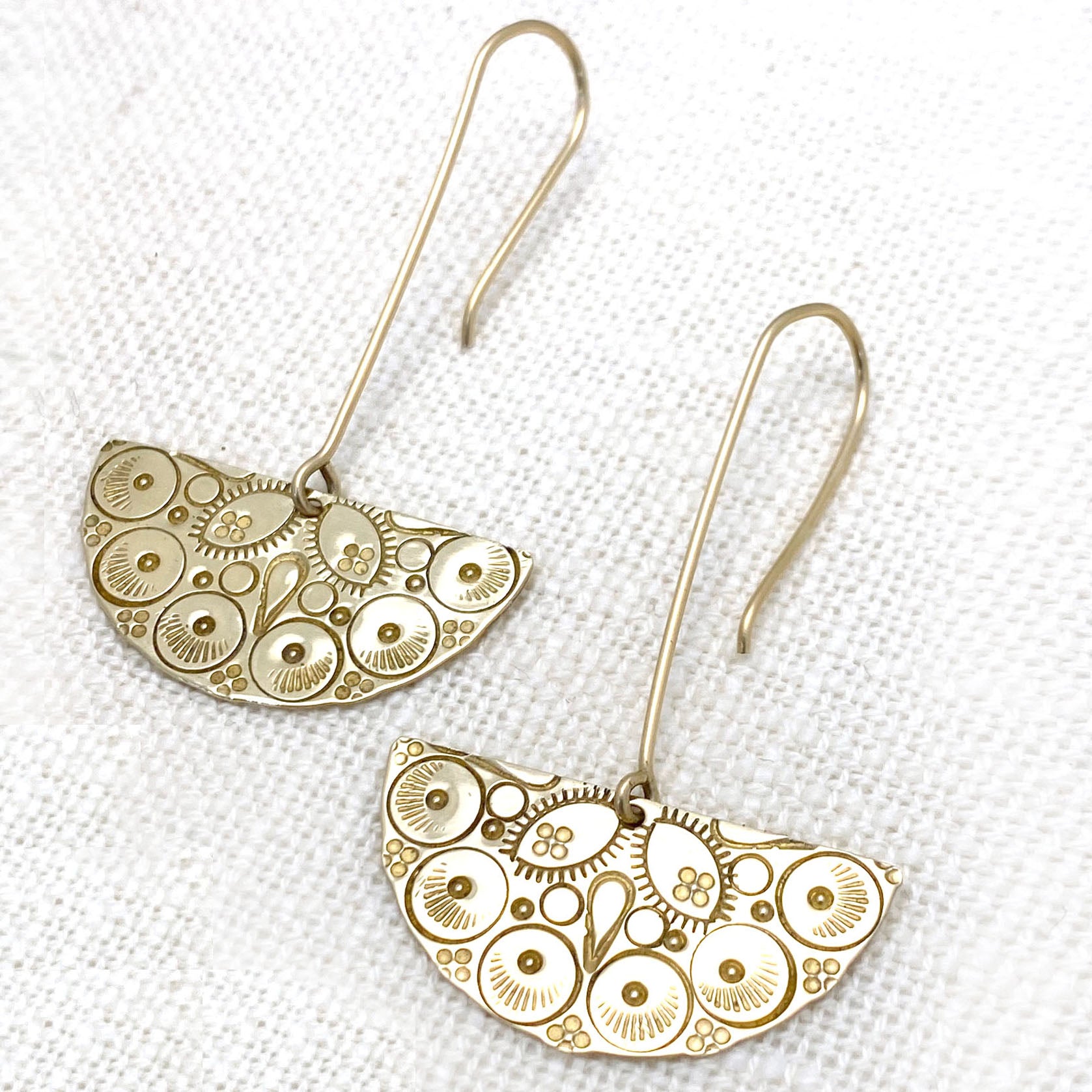 In this class we will learn how to stamp on metal. We will make a pair of stamped metal earrings like the ones shown here. It is the perfect project for beginners and beyond. Author and designer, Taryn McCabe will show you the ins and outs of making your own stamped mandala earrings.